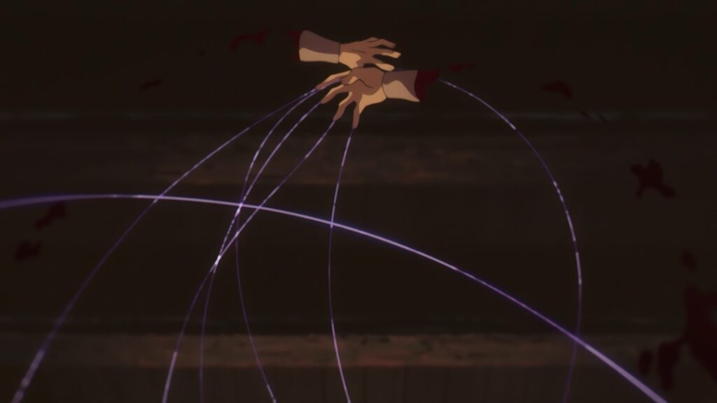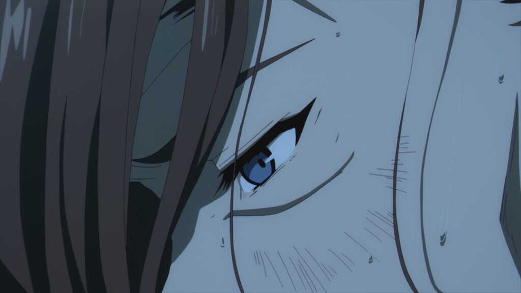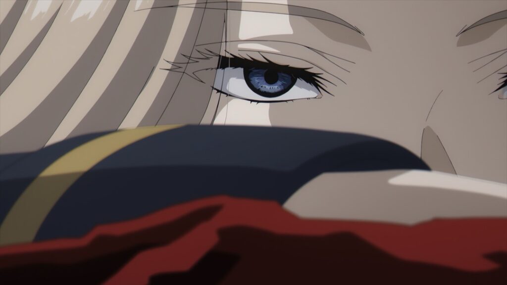 The visuals of the anime feature sometimes curious frames, like this close shot where we can see the eye’s and eyelashes’ outlines behind the hair — stroked, but without the matching color fill. Stylish!