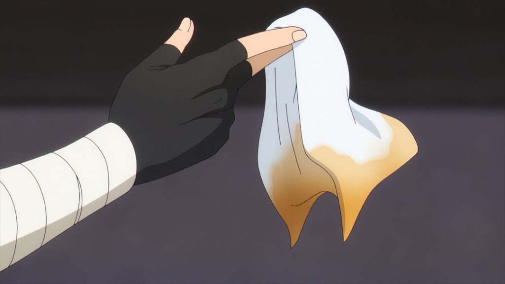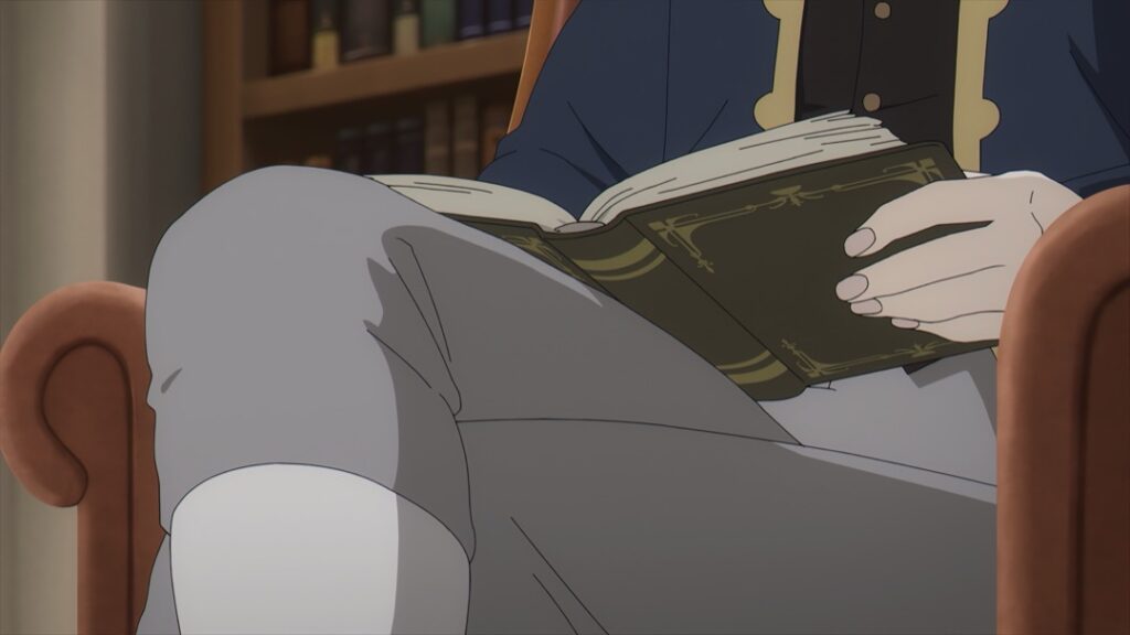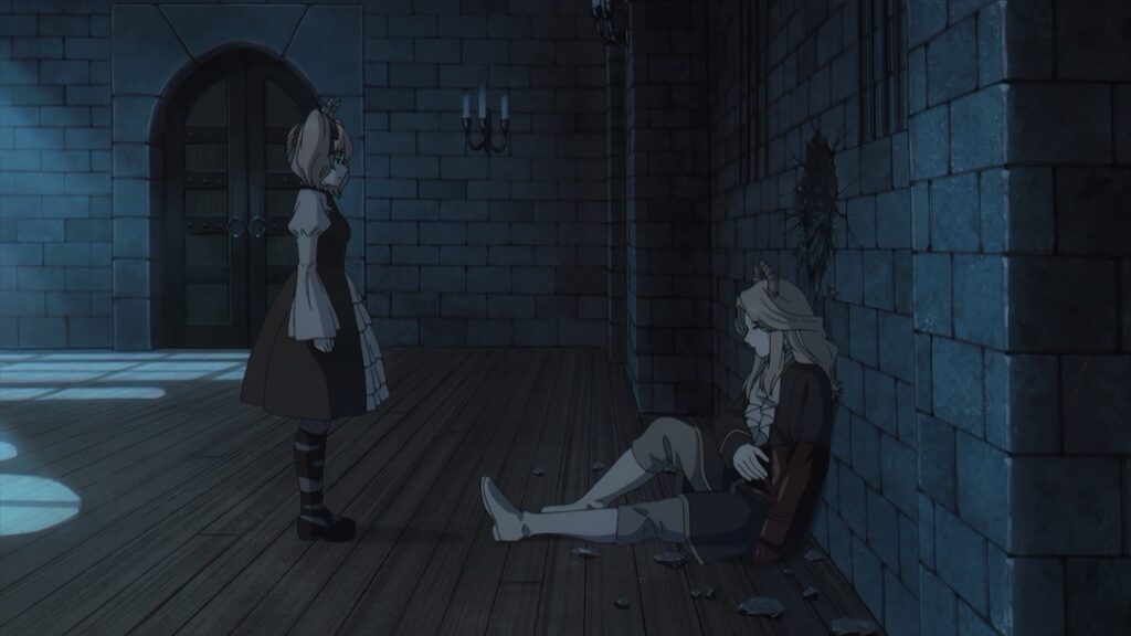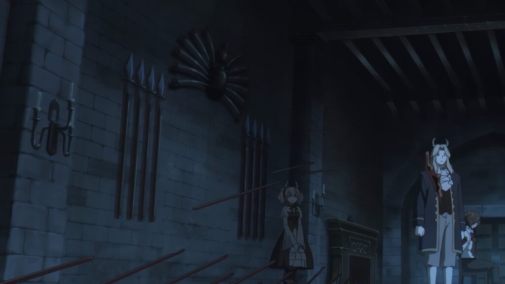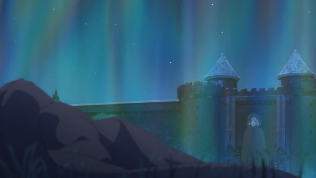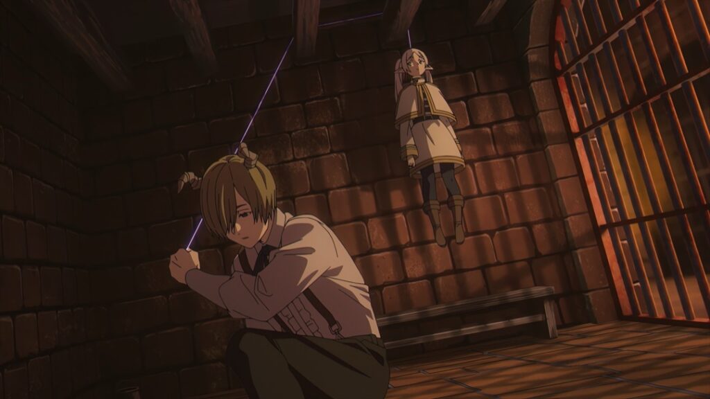 Same as in EP.02, Fern moves small objects with a “telekinesis” spell that might be the same or related to the one that floats objects. With it, she opens the window from inside. This magic is not so common between mages apparently, but Fern learns it from Frieren, and even uses it to recover her fallen staff in the next episode.