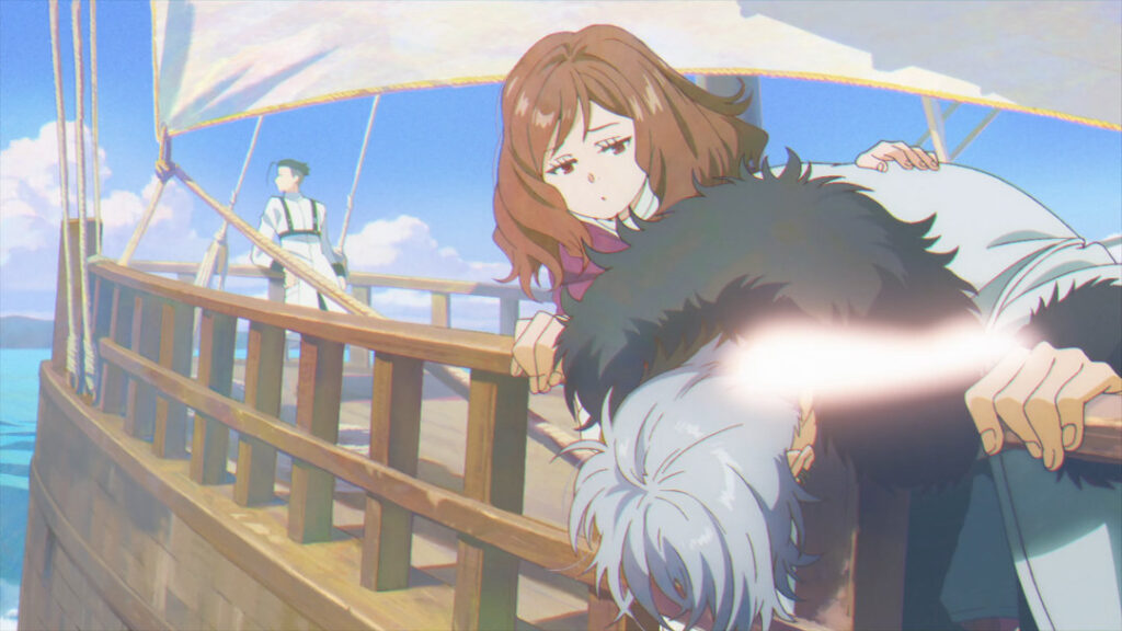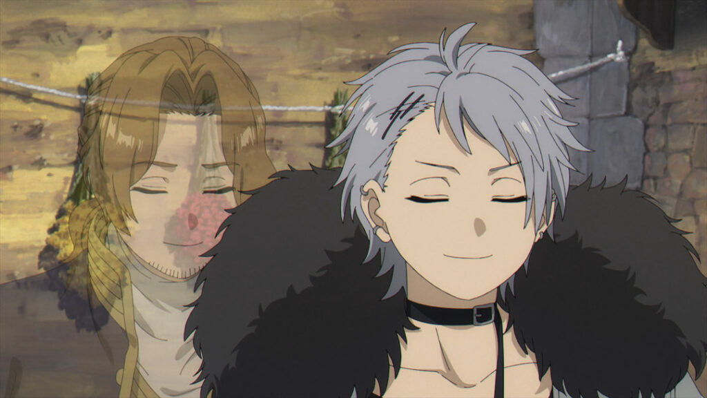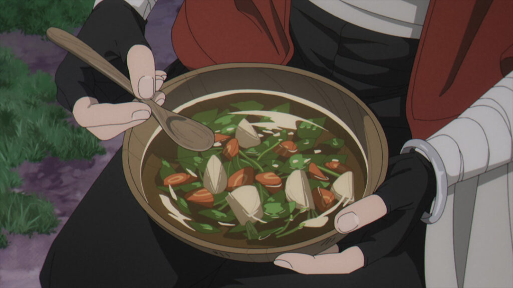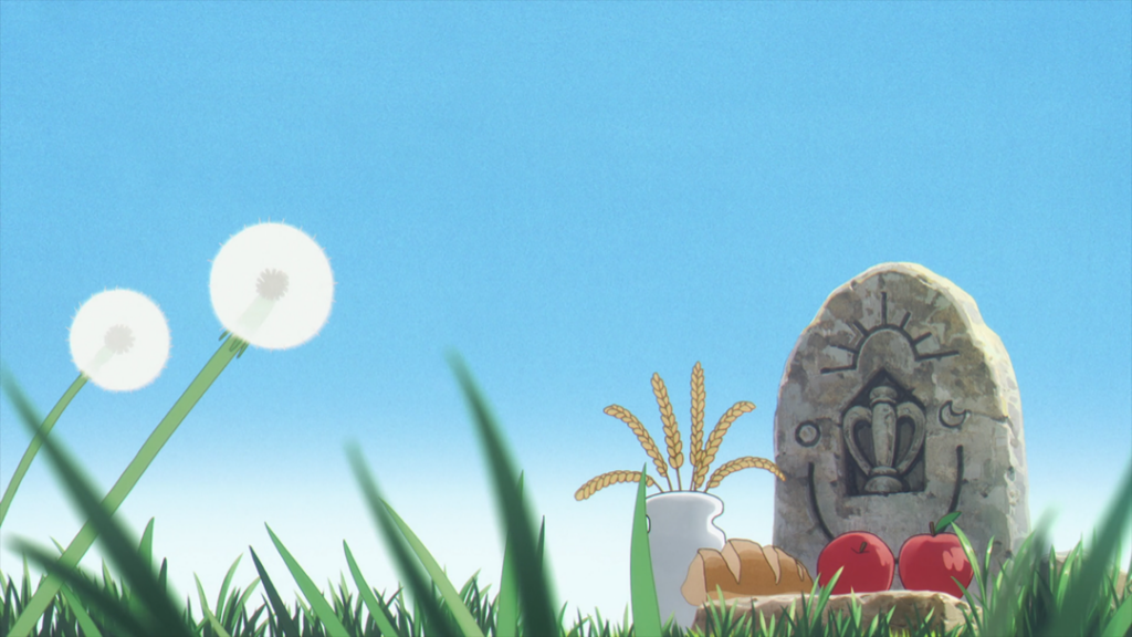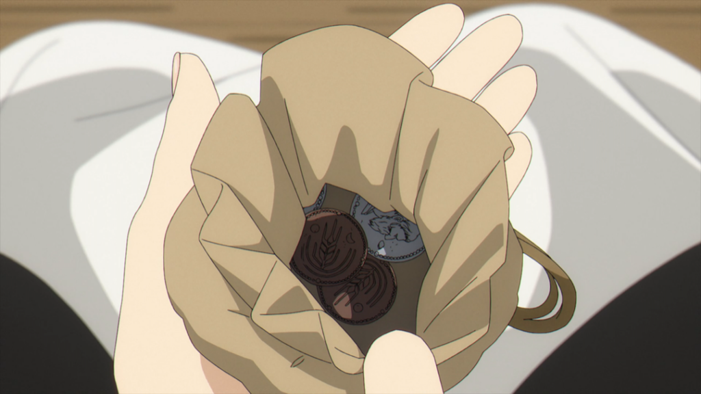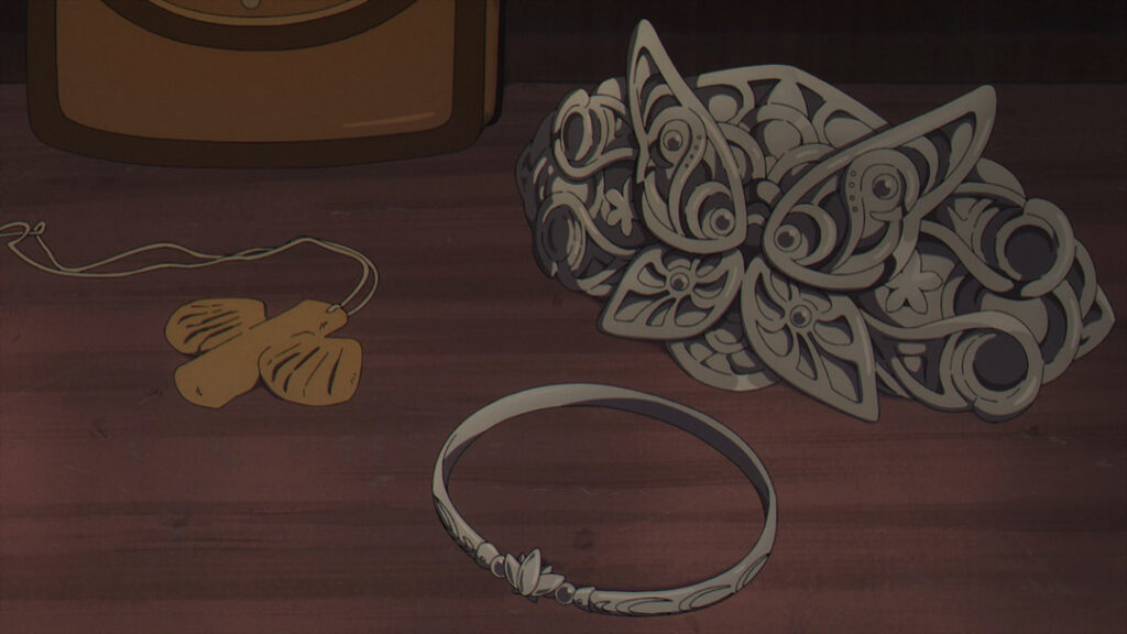 In this original scene (not on the manga) we can observe Fern taking off the pendant from Kraft (S01EP10), putting it alongside the Handbag from Sein (S01EP14) and her other two accessories. And how she appreciates even more now Stark’s efforts to protect her and be nice to her.