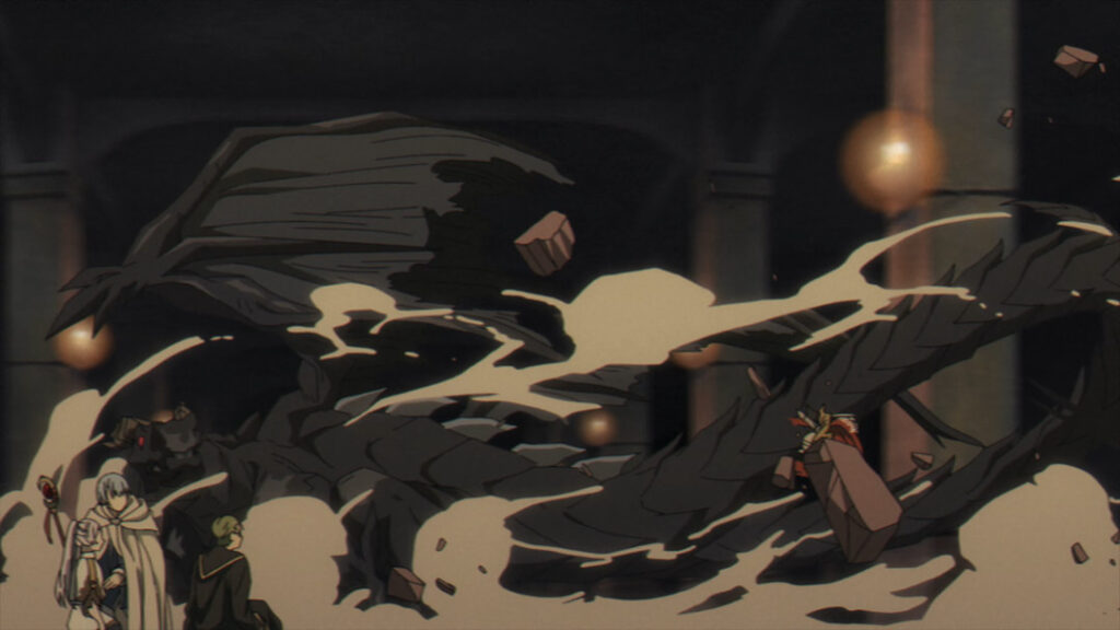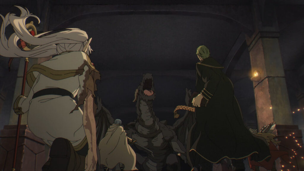 This special intro for the Episode is a special one, not featured in the manga. It replicates much of the scenes and atmosphere of the introduction of the first Episode of season 01, like a kind of homage. And also show us this first travel stage from รuรerst, until they reach the cave beyond the marshes.